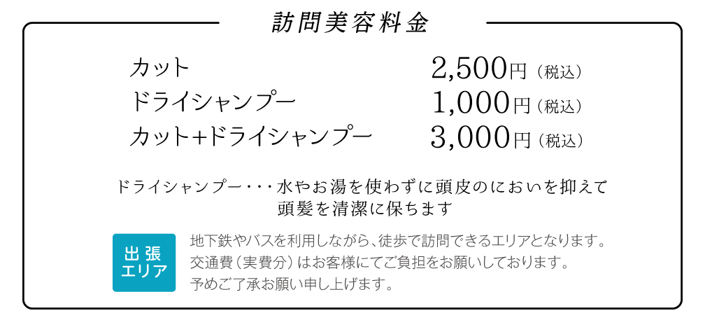 病気・ケガ等によりご自宅や施設で療養をされている、外出が困難なお客様のお役に立てればと思い、訪問美容のお仕事をさせて頂いております。まずは、しっかりカウンセリングをおこないご安心、ご納得の上で、出張施術をさせて頂きます。訪問曜日、時間、料金など、お気軽にご相談ください。